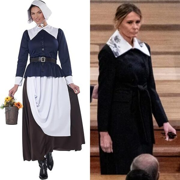 Melania was having a rough one today. The only thing clean in her closet was a pilgrim costume and she must have had a falling out with her hair and make-up team. Poor thing even has the memorial program upside down. pic.twitter.com/4v14GuPF7S
