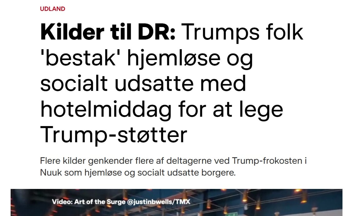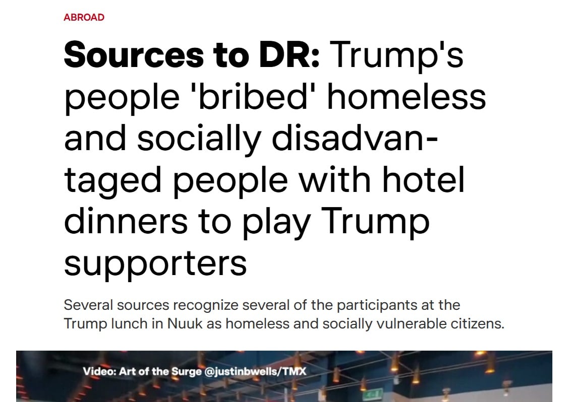 Here’s what Danish media got from it, however: “Several sources now tell DR that a portion of the people who appear in the video from Trump’s campaign people …are homeless and socially disadvantaged, who often find themselves outside the Brugsen in Nuuk …which is located directly opposite Hotel Hans Egede.”