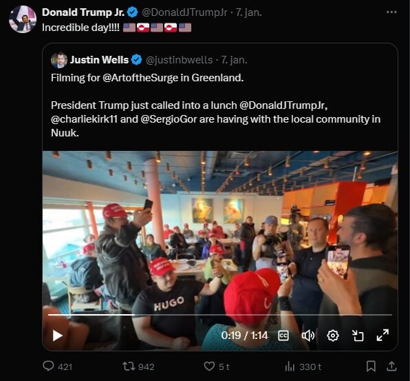 The eldest Trump boy got his dad to call in while he fed his “MAGA supporters” beef stew at the Hotel Hans Egede, then posted a clip to social media to brag about how everyone around the world loves his dad: